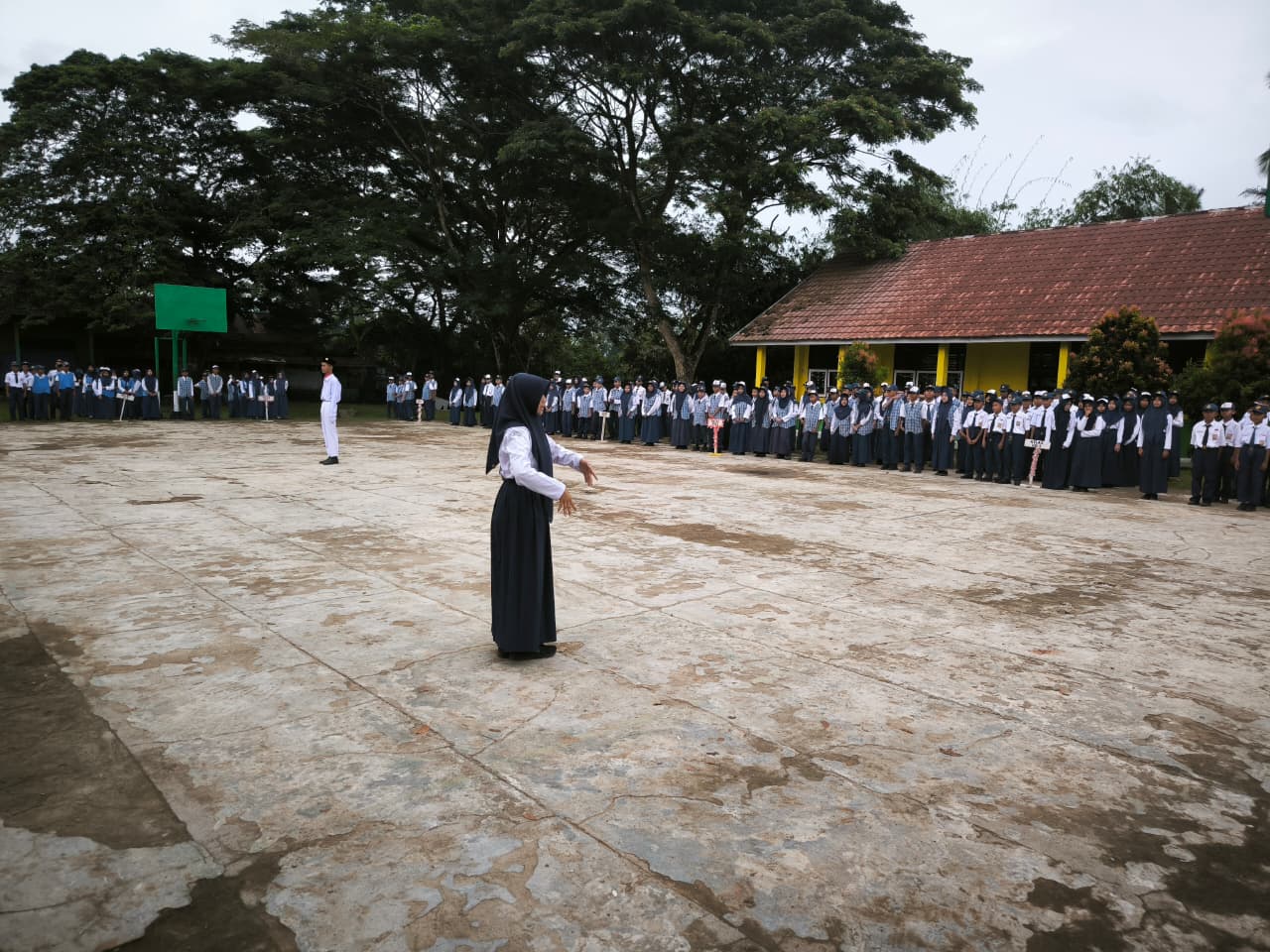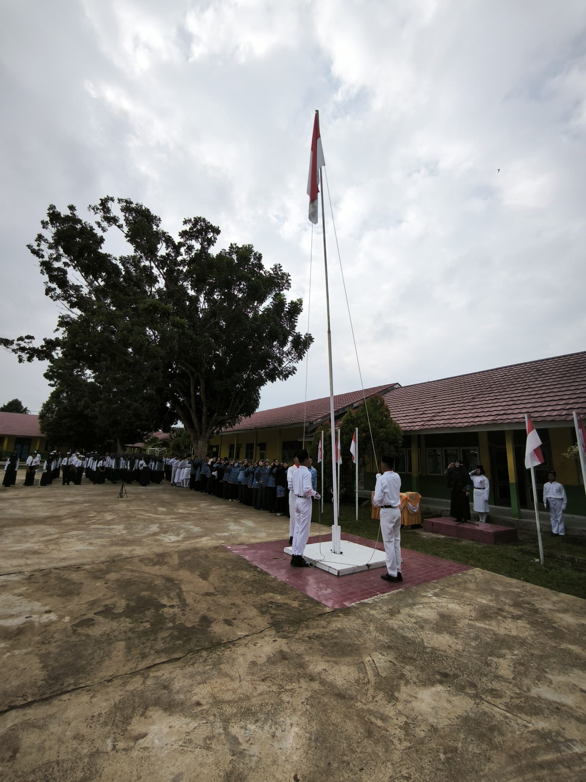 Upacara dipimpin oleh guru senior, Hj. Santi Agustina, S.Pd, yang tampil sebagai pembina upacara. Dengan wibawa dan suara yang tegas, beliau membacakan amanat Kepala Sekolah yang berhalangan hadir.